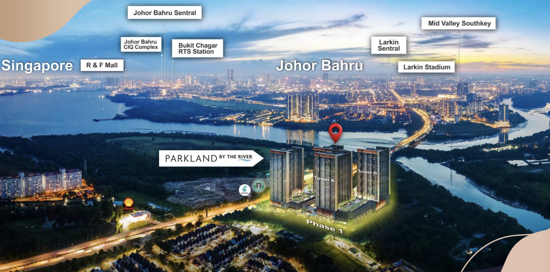 Parkland by the river is located in the heart of Permas Jaya, Johor Bahru, strategically positioned next to the Permas Bridge. This prime location offers excellent connectivity, with just a 10-minute drive to the Johor–Singapore Causeway (CIQ) and only 5 minutes to Mid Valley Southkey. The area is well-served by amenities such as AEON Permas Jaya, schools, banks, and commercial hubs.